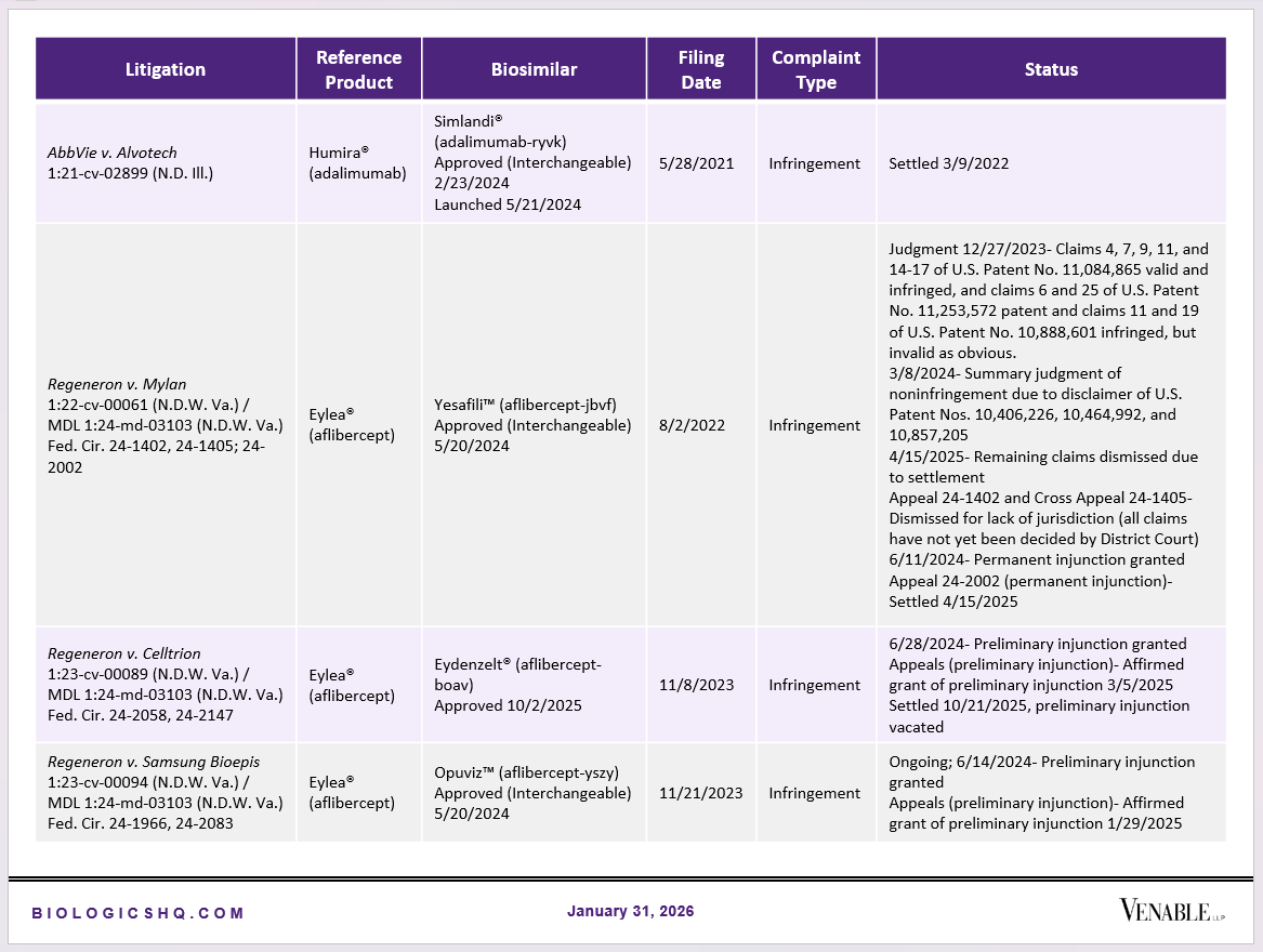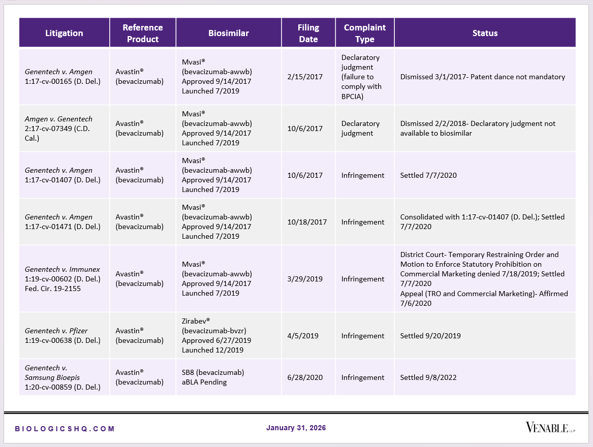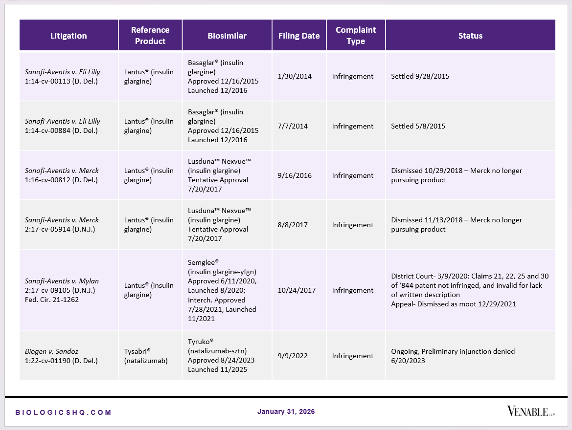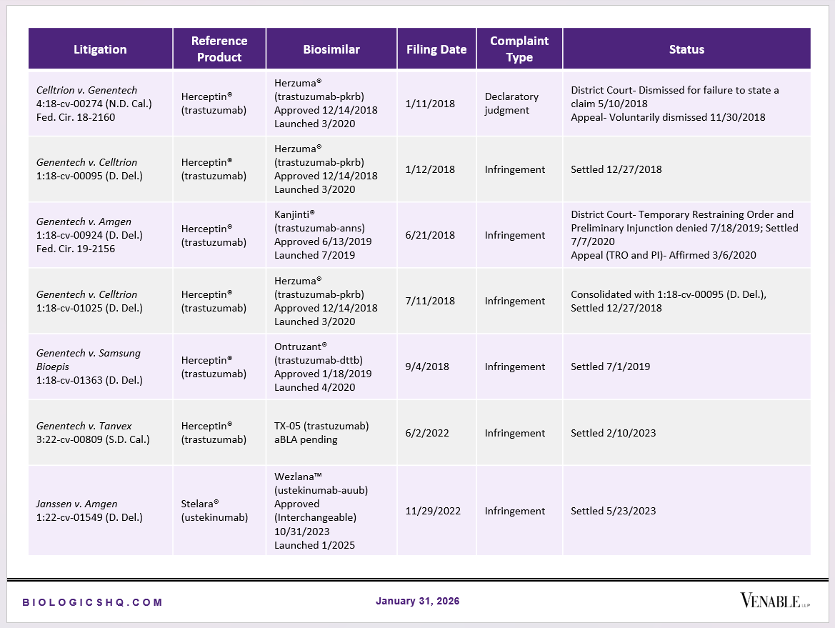 Biosimilar Litigations include litigations relating to biosimilar/follow-on products of CDER-listed reference products. Litigations between biosimilar applicants/manufacturers and reference product sponsors as well as litigations between two biosimilar applicants/manufacturers are included. Litigations relating to disputes between two reference product sponsors, or non-practicing entities/universities and reference product sponsors are not included. Litigations related solely to manufacturing patents that may be relevant to multiple products (for example, U.S. Patent Nos. 6,331,415, 7,923,221, and 4,816,567 (“Cabilly Patents”)) also are not included.