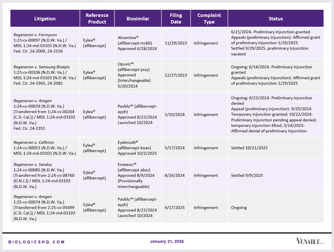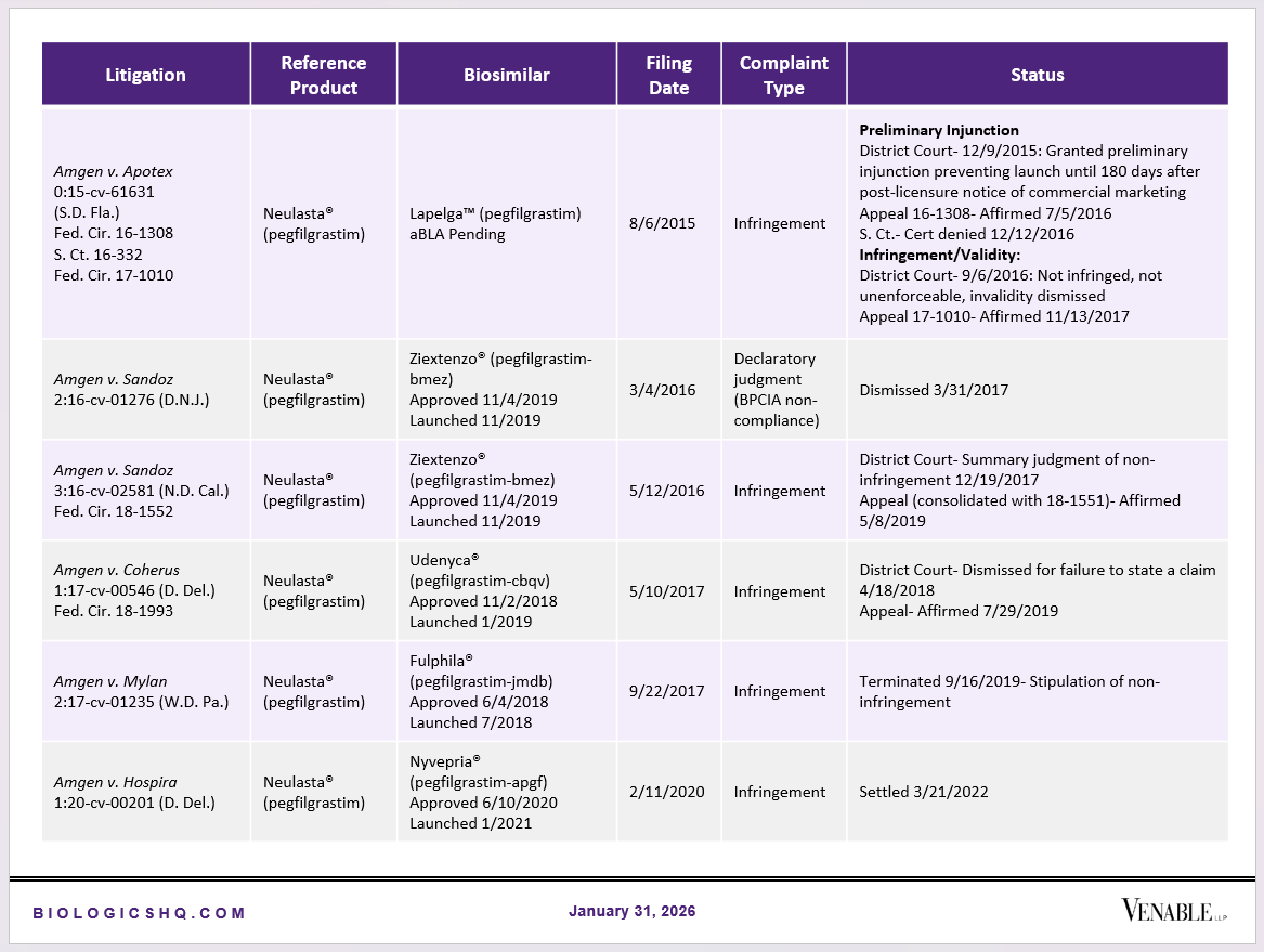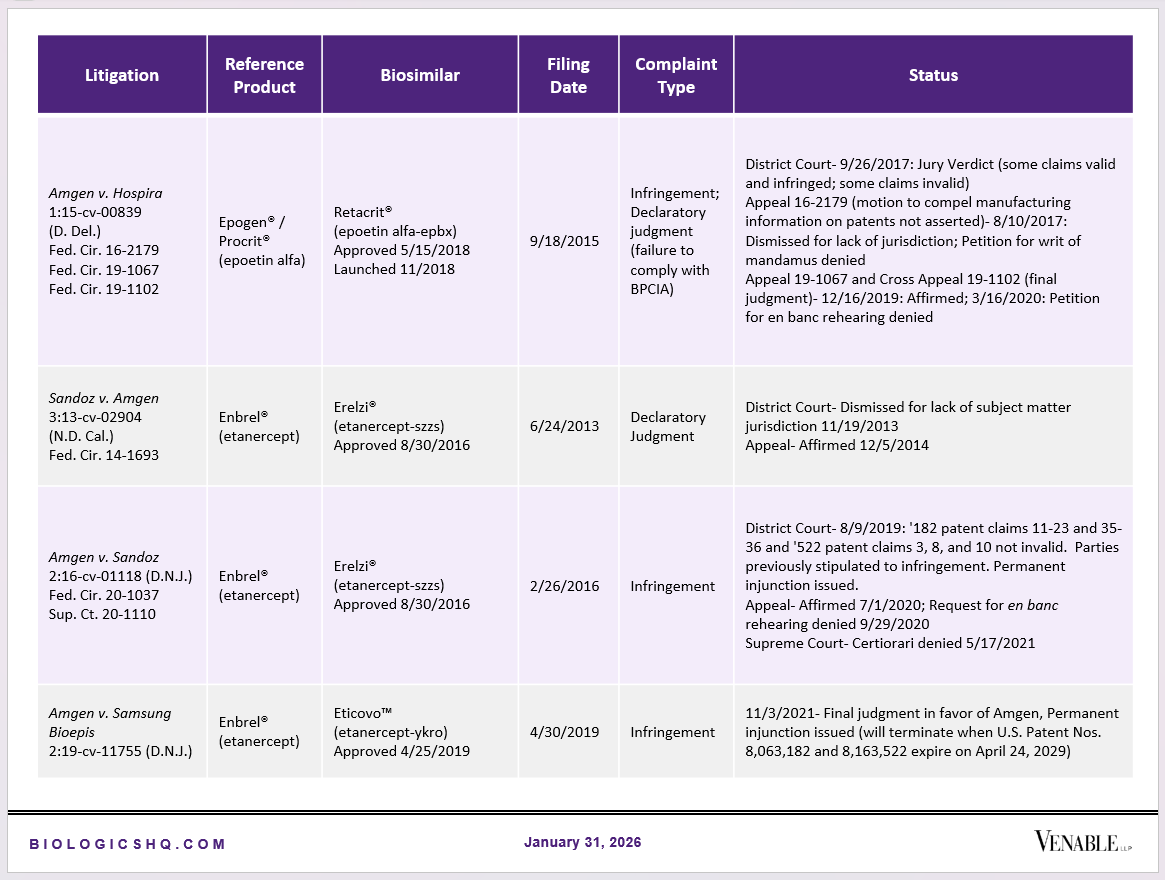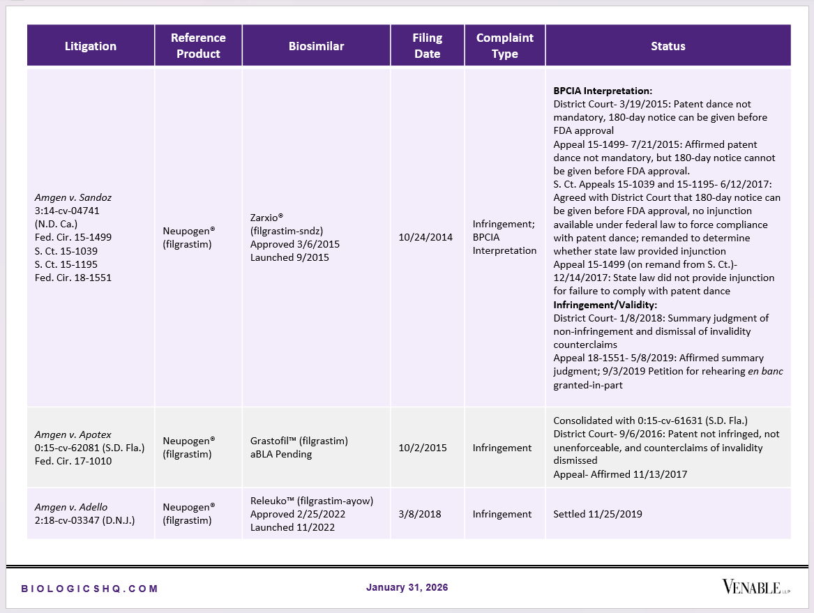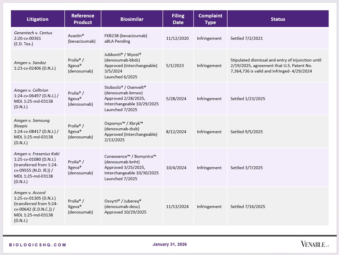 Biosimilar Litigations include litigations relating to biosimilar/follow-on products of CDER-listed reference products. Litigations between biosimilar applicants/manufacturers and reference product sponsors as well as litigations between two biosimilar applicants/manufacturers are included. Litigations relating to disputes between two reference product sponsors, or non-practicing entities/universities and reference product sponsors are not included. Litigations related solely to manufacturing patents that may be relevant to multiple products (for example, U.S. Patent Nos. 6,331,415, 7,923,221, and 4,816,567 (“Cabilly Patents”)) also are not included.