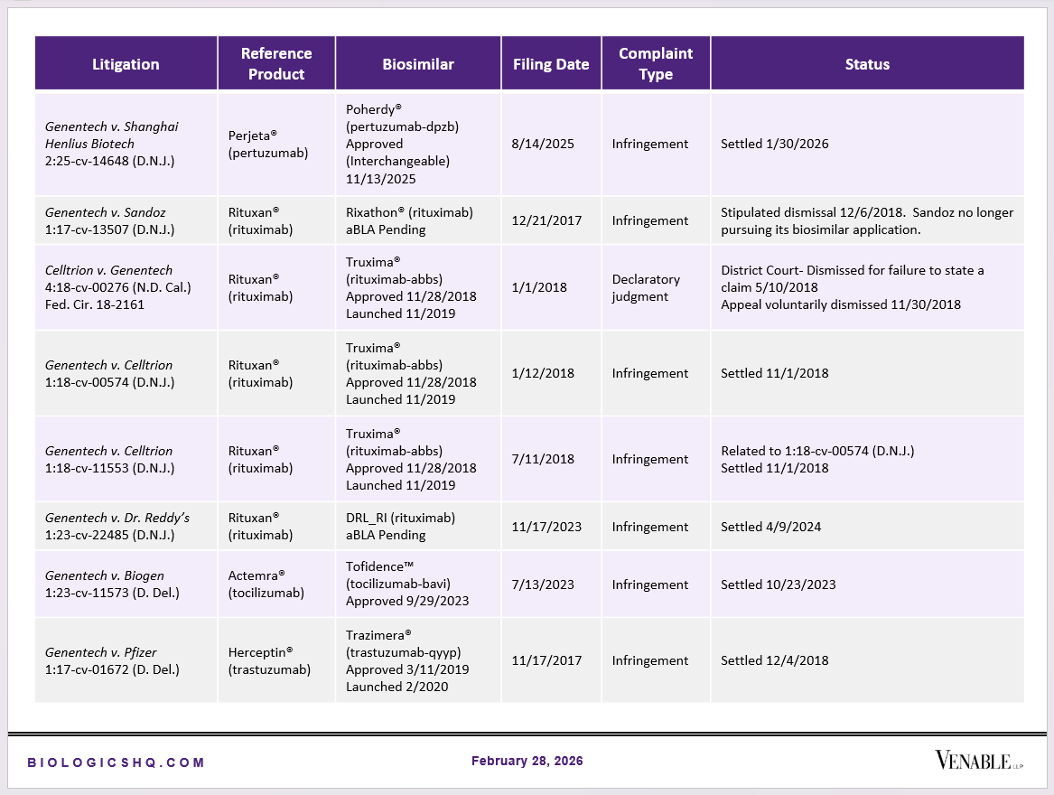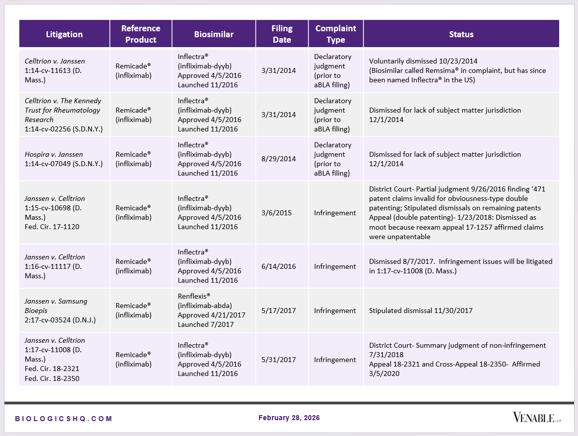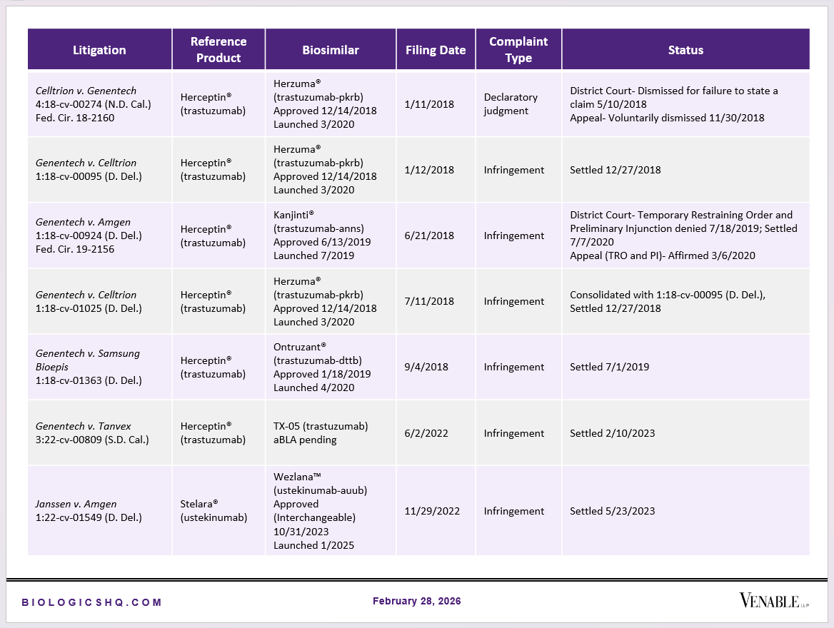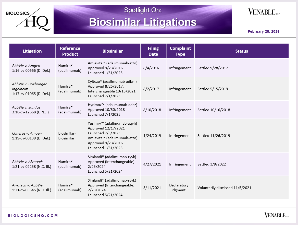 Biosimilar Litigations include litigations relating to biosimilar/follow-on products of CDER-listed reference products. Litigations between biosimilar applicants/manufacturers and reference product sponsors as well as litigations between two biosimilar applicants/manufacturers are included. Litigations relating to disputes between two reference product sponsors, or non-practicing entities/universities and reference product sponsors are not included. Litigations related solely to manufacturing patents that may be relevant to multiple products (for example, U.S. Patent Nos. 6,331,415, 7,923,221, and 4,816,567 (“Cabilly Patents”)) also are not included.