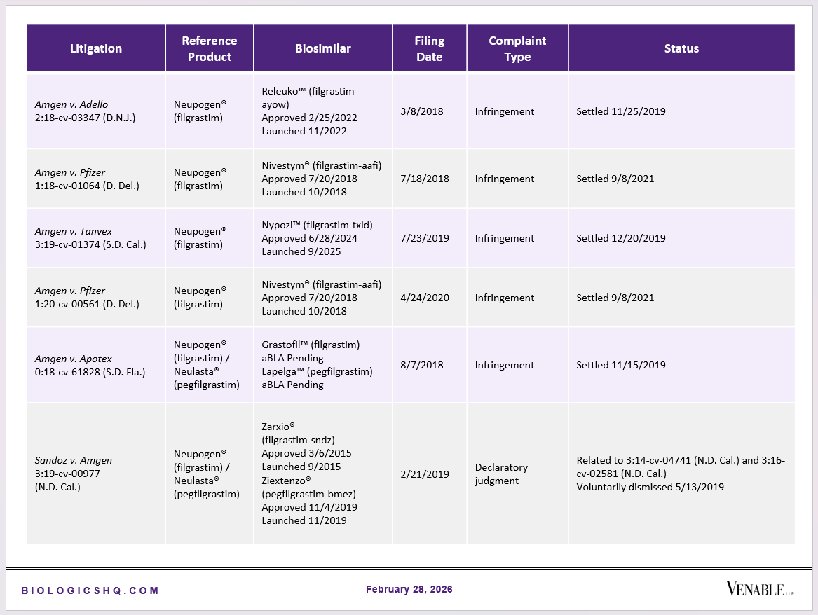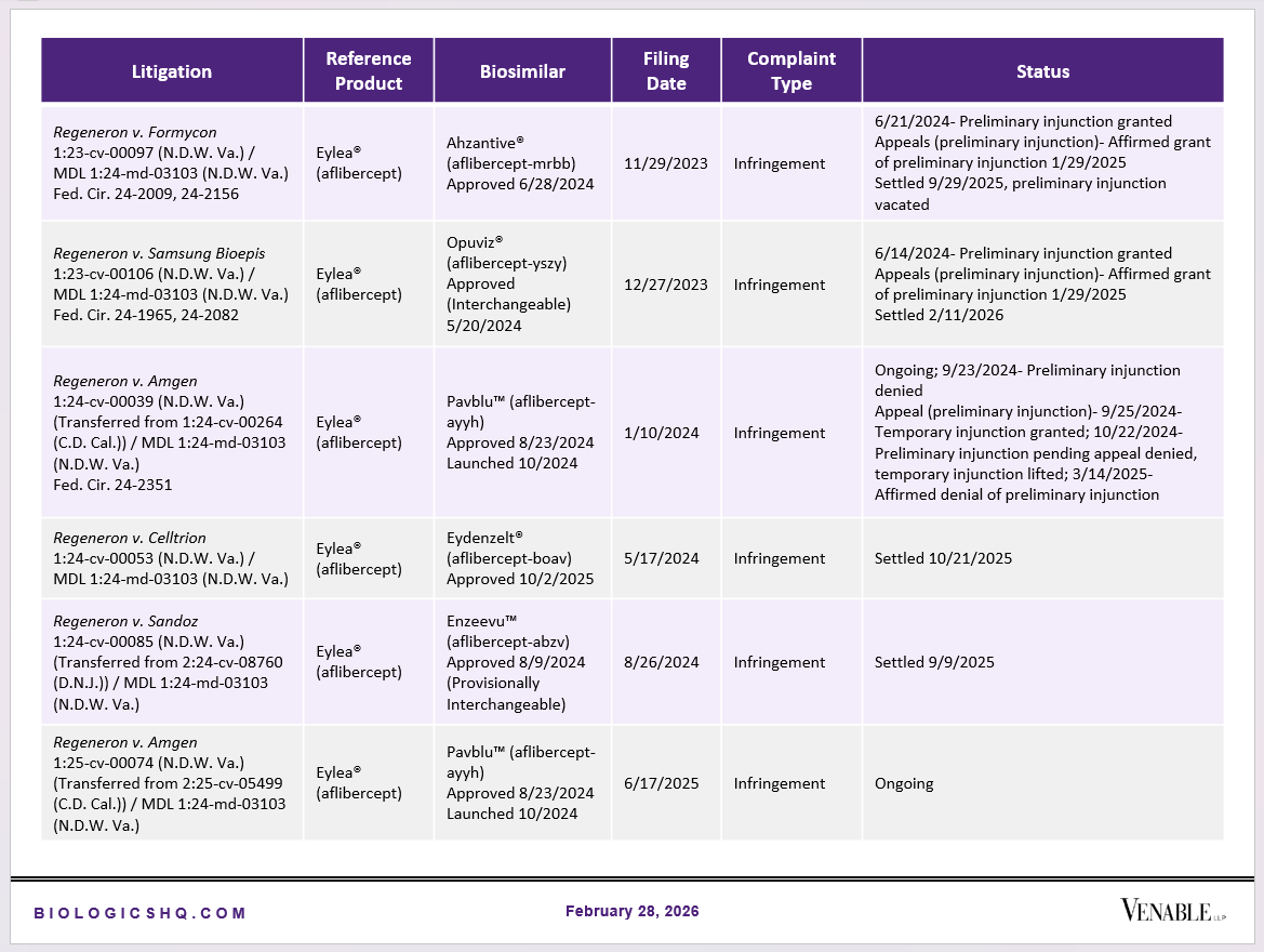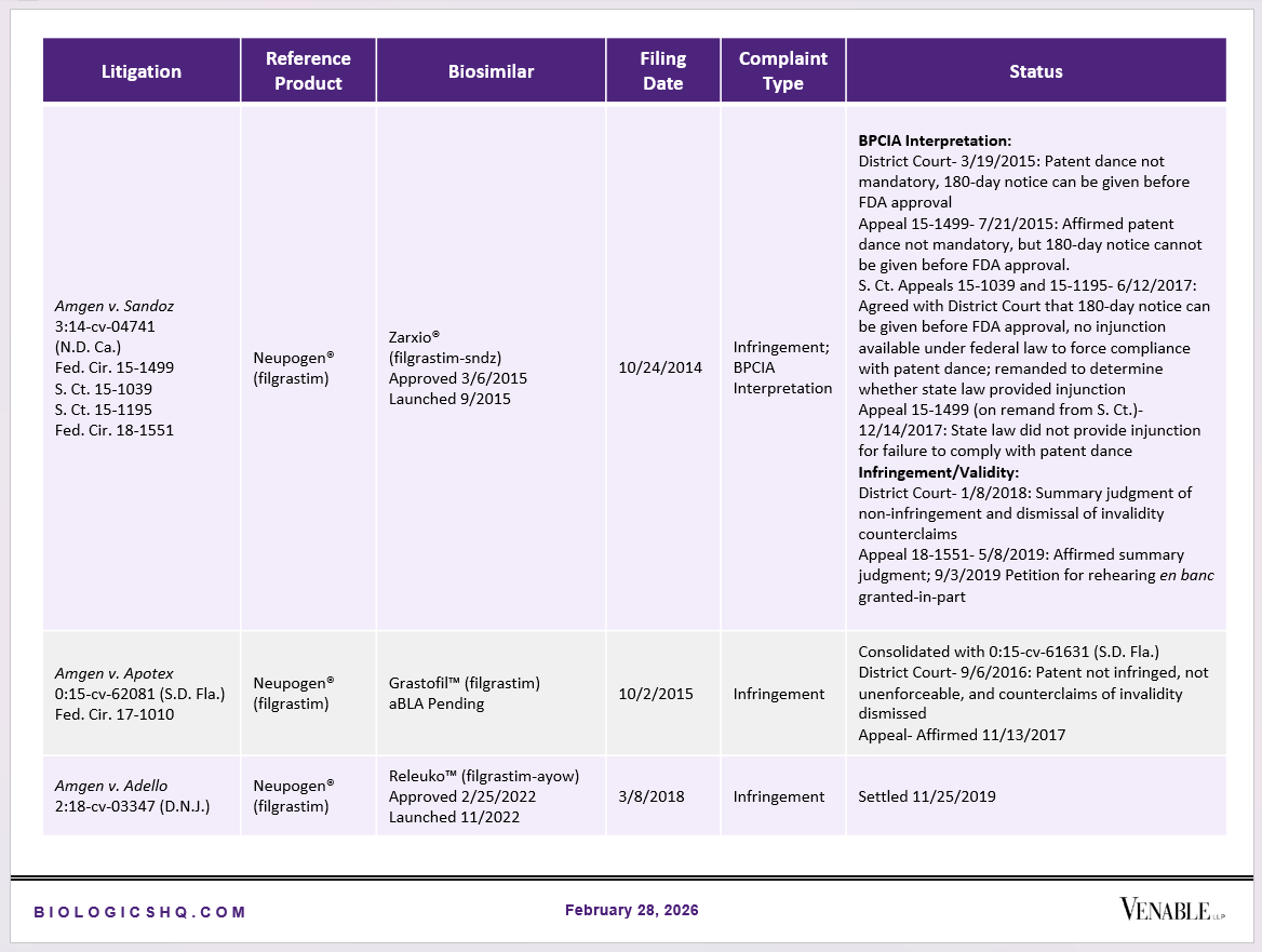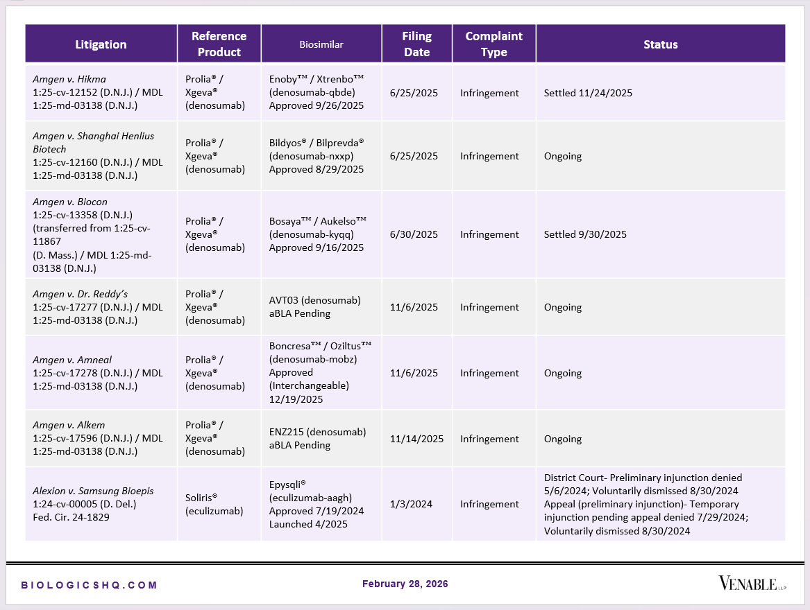 Biosimilar Litigations include litigations relating to biosimilar/follow-on products of CDER-listed reference products. Litigations between biosimilar applicants/manufacturers and reference product sponsors as well as litigations between two biosimilar applicants/manufacturers are included. Litigations relating to disputes between two reference product sponsors, or non-practicing entities/universities and reference product sponsors are not included. Litigations related solely to manufacturing patents that may be relevant to multiple products (for example, U.S. Patent Nos. 6,331,415, 7,923,221, and 4,816,567 (“Cabilly Patents”)) also are not included.