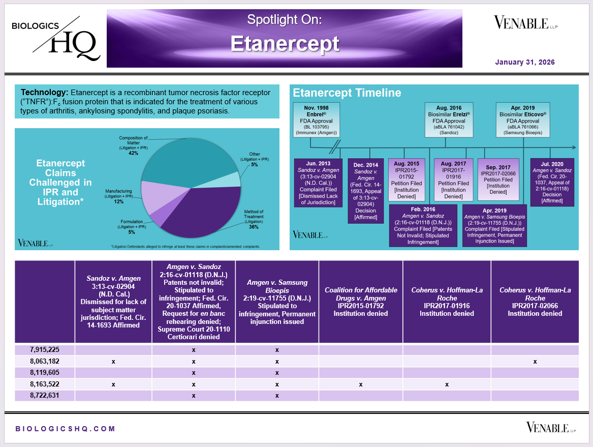 *Etanercept Challenged Claim Types in IPR and Litigation: Claims include those challenged in litigations and IPRs.  Claims are counted in each litigation and IPR, so claims from the same patent challenged in multiple litigations/IPRs are counted more than once.  Within each litigation a claim is counted only once.  Within each IPR, claims are counted only once, whether they are challenged under § 102, § 103, or both.  Claims in litigations are determined based on claims alleged infringed in Complaints.