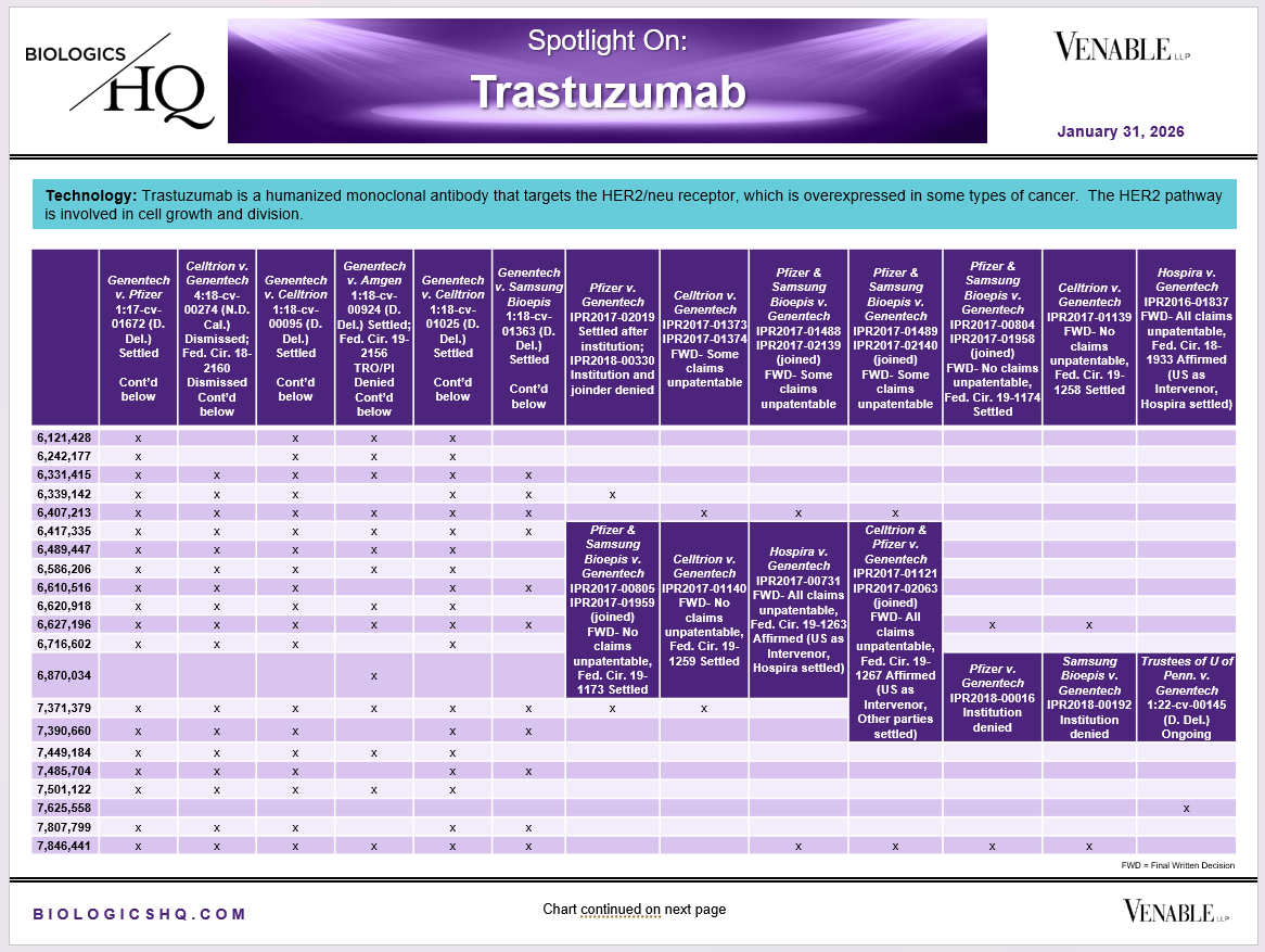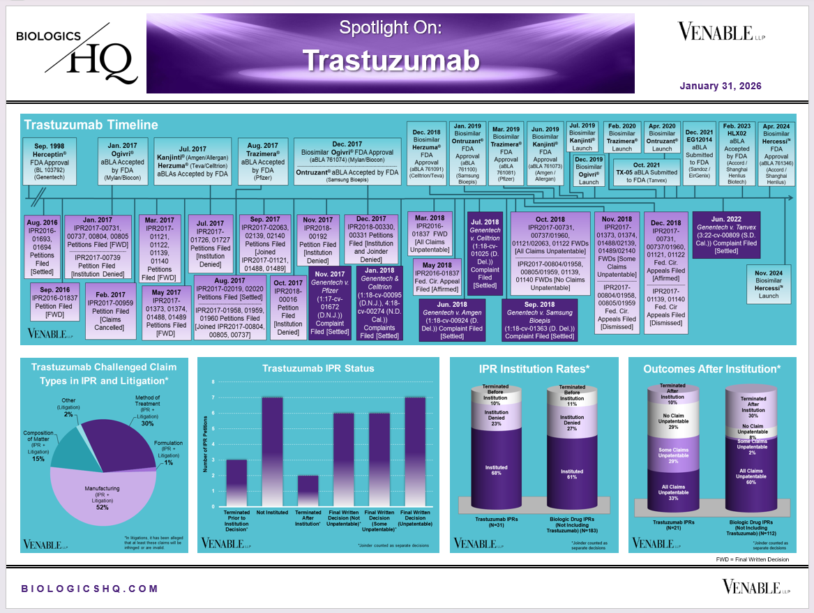 *Trastuzumab Challenged Claim Types in IPR and Litigation: Claims include those challenged in litigations and IPRs. Claims are counted in each litigation and IPR, so claims from the same patent challenged in multiple litigations/IPRs are counted more than once. Within each litigation a claim is counted only once. Within each IPR, claims are counted only once, whether they are challenged under § 102, § 103, or both. Claims in litigations are determined based on claims alleged to be infringed or invalid in Complaints.
