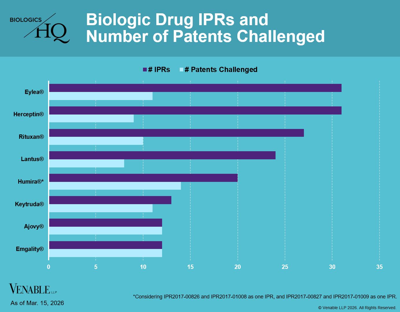 Data shown only for the subset of CDER-listed biologic drugs with the greatest number of Biologic Drug IPRs: Herceptin®, Eylea®, Rituxan®, Lantus®, Humira®, Keytruda®, Ajovy®, and Emgality®.