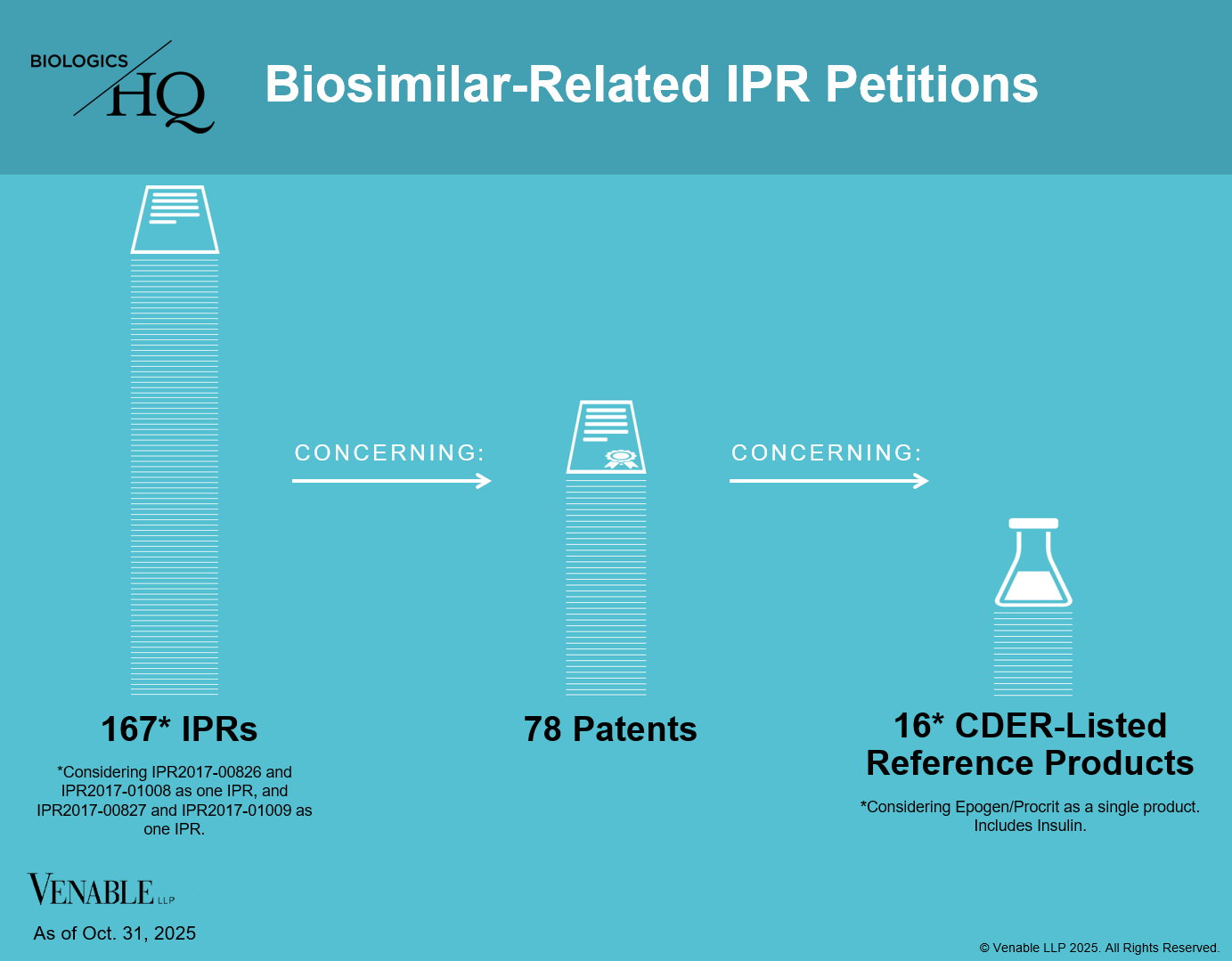 Biosimilar-Related IPR Petitions include IPR petitions relating to biosimilar/follow-on products. IPR petitions relating to disputes between reference product sponsors, or non-practicing entities/universities and reference product sponsors are not included. IPR petitions relating to manufacturing patents that may be relevant to multiple products (for example, U.S. Patent No. 6,331,415 (a “Cabilly” patent)) also are not included.