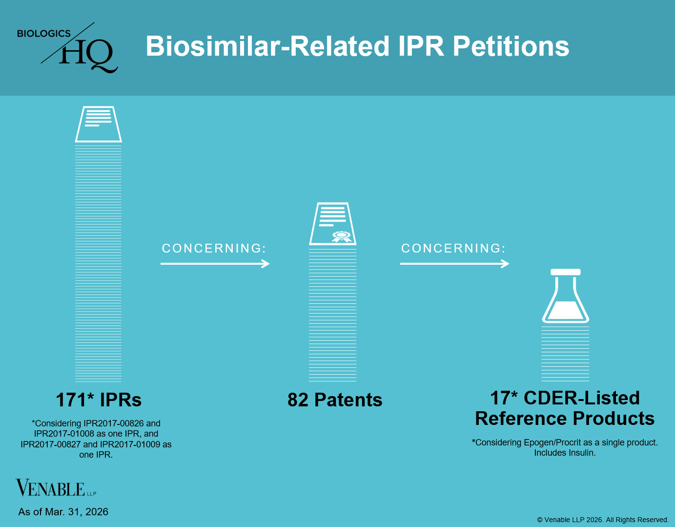 Biosimilar-Related IPR Petitions include IPR petitions relating to biosimilar/follow-on products. IPR petitions relating to disputes between reference product sponsors, or non-practicing entities/universities and reference product sponsors are not included. IPR petitions relating to manufacturing patents that may be relevant to multiple products (for example, U.S. Patent No. 6,331,415 (a “Cabilly” patent)) also are not included.
