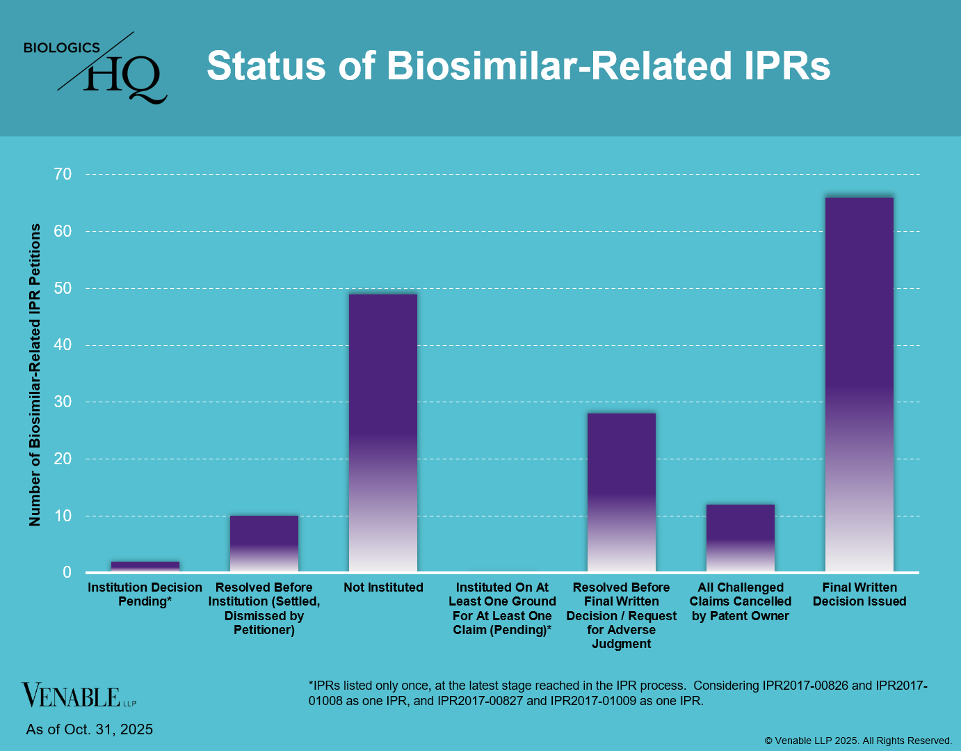 Biosimilar-Related IPR Petitions include IPR petitions relating to biosimilar/follow-on products. IPR petitions relating to disputes between reference product sponsors, or non-practicing entities/universities and reference product sponsors are not included. IPR petitions relating to manufacturing patents that may be relevant to multiple products (for example, U.S. Patent No. 6,331,415 (a “Cabilly” patent)) also are not included.